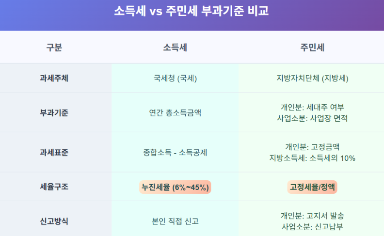 | 과세 대상 | 한 해 모든 소득(근로·사업·이자 등) | 개인분: 주소지 기준 고정액 사업소·재산분: 사업장 규모·면적·급여 |